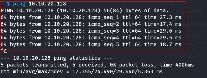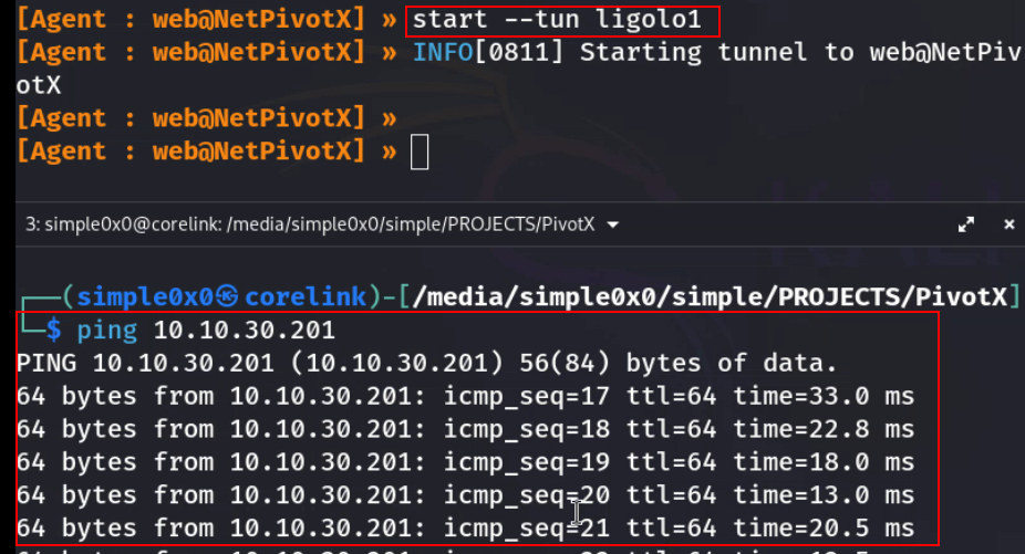 If set up correctly, you’ll see replies. Ligolo-ng’s TUN interface will typically show an IP from the agent’s network. This completes the tunnel establishment.