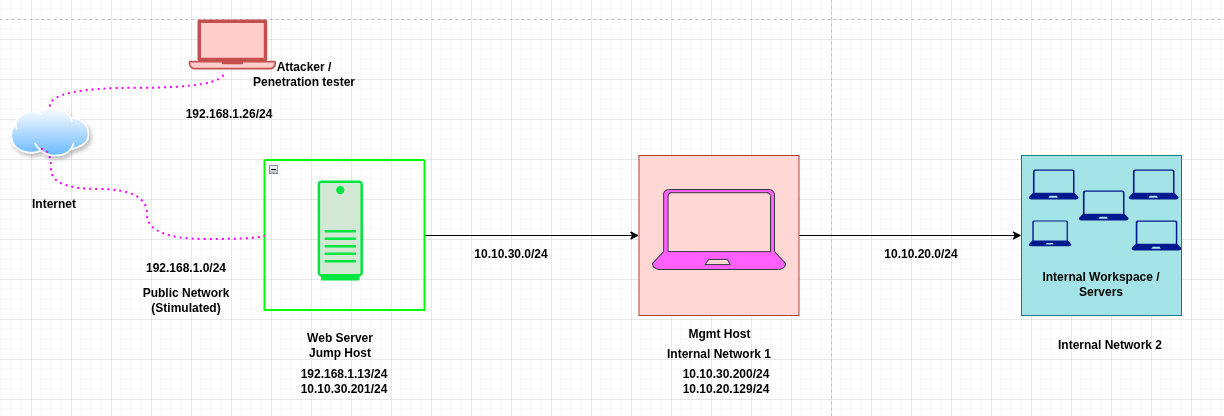 10.10.30.0/24but hosts within this network can't directly reach the attacker's host, but to make this possible host within this network will instead communicate directly with the Jump Host10.10.30.201which will then redirect the traffic from a specific port to the attacker's host