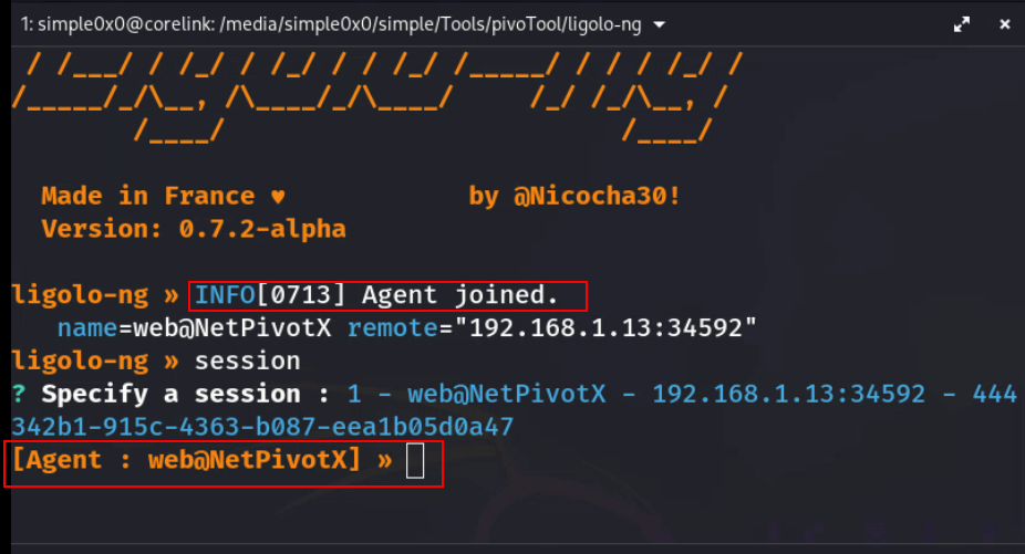Back on the attacker, you should see the Ligolo proxy register the new session. Use the Ligolo CLI to select it (the exact prompt depends on version, but often ligolo-ng » session will list active sessions. to select from.