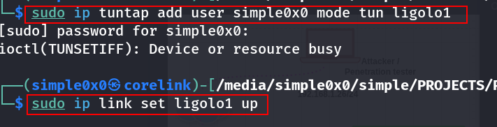 $ sudo ip tuntap add user $(whoami) mode tun ligolo1 $ sudo ip link set ligolo1 up