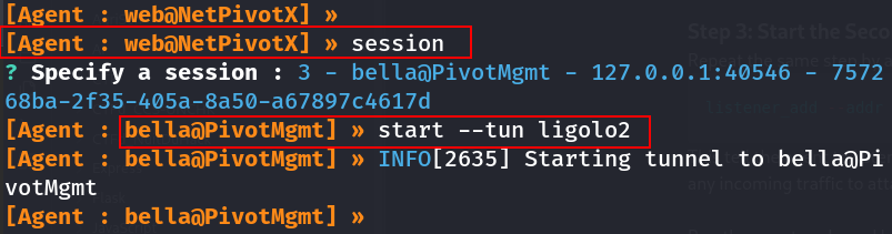 [Agent : web@NetPivotX] » start --tun ligolo1