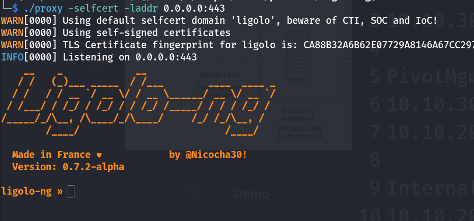 sudo ligolo-proxy -selfcert -laddr 0.0.0.0:443