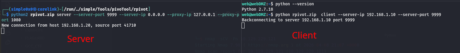 python2 rpivot.zip server --server-port 9999 --server-ip 0.0.0.0 --proxy-ip 127.0.0.1 --proxy-port 1080 python2 rpivot.zip client --server-ip 192.168.1.10 --server-port 9999