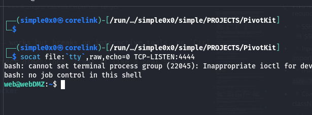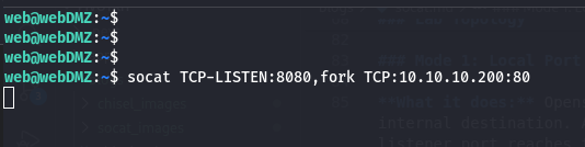 # Generic socat TCP-LISTEN:LISTEN_PORT,fork TCP:TARGET_IP:TARGET_PORT # Lab example - expose Admin Mgmt port 80 via Web DMZ socat TCP-LISTEN:8080,fork TCP:10.10.10.200:80