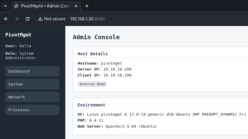 You've accessed Admin Mgmt via Web DMZ. Now you need to reach Internal File Server at 10.10.20.200 - a host only accessible from Admin Mgmt's 10.10.20.0/24 interface.