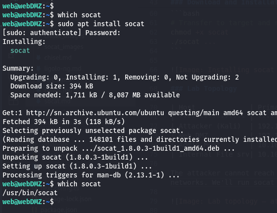 The key advantage: socat is already installed on most Linux systems. On Kali, Debian, Ubuntu, and many pentest targets, it's available without any transfer. That eliminates one of the most common detection vectors: a suspicious binary appearing in /tmp.