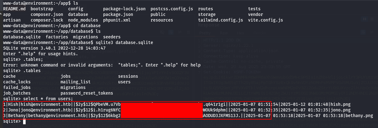 Navigating to /var/www/app/database reveals the database.sqlite which gave us access to users bcrypt password hashes which is can brute forced