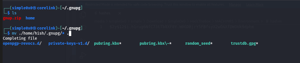 www-data@environment:/home/hish/.gnupg$ ls openpgp-revocs.d private-keys-v1.d pubring.kbx pubring.kbx~ random_seed trustdb.gpg www-data@environment:/home/hish/.gnupg$