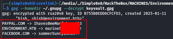 └─$ gpg --homedir ~/.gnupg --decrypt keyvault.gpg gpg: encrypted with rsa2048 key, ID B755B0EDD6CFCFD3, created 2025-01-11 "hish_ <[email protected]>" PAYPAL.COM -> Ihaves0meMon$yhere123 ENVIRONMENT.HTB -> marineSPm@ster!! FACEBOOK.COM -> summerSunnyB3ACH!!