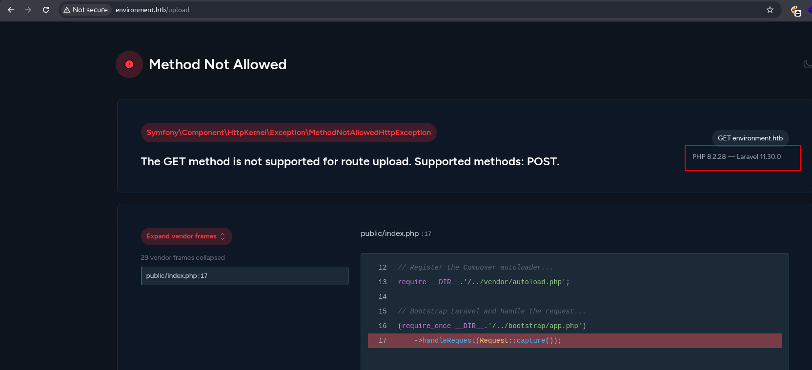 The http://environment.htb/upload reveal a debug page - revealing the framework and it's version PHP 8.2.28 — Laravel 11.30.0