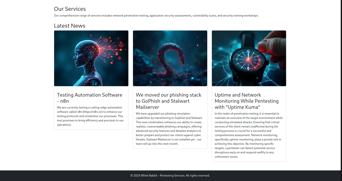 While navigating the website, we see a service for penetration testing being advertised. Checking out the Latest News section reveals services being used.