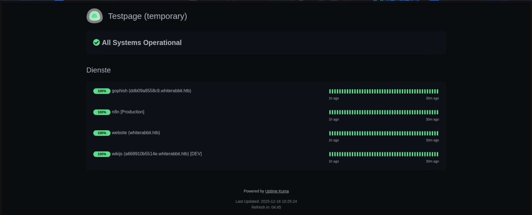 WhiteRabbit is an insane-difficulty Linux target hosting an uptime-monitoring platform. Initial enumeration of a public status page reveals multiple subdomains, including an internal wiki containing sensitive documentation. The wiki discloses the use of GoPhish integrated with n8n workflows for automated phishing analysis.