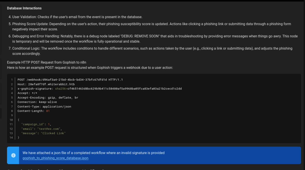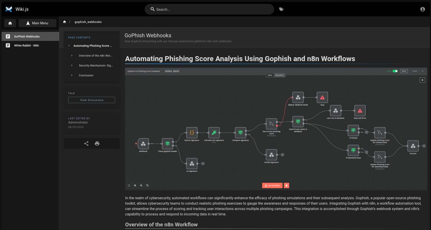 Accessing the Wiki.js link, we can navigate to Main menu then GoPhish Webhooks and read about the n8n workflow from a GoPhish webhook that works with phishing data and writes to database.